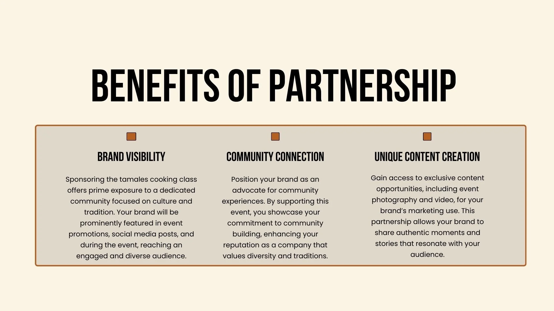 A digital infographic titled 'Benefits of Partnership' listing three benefits: Brand Visibility, Community Connection, and Unique Content Creation, with descriptive text for each benefit.