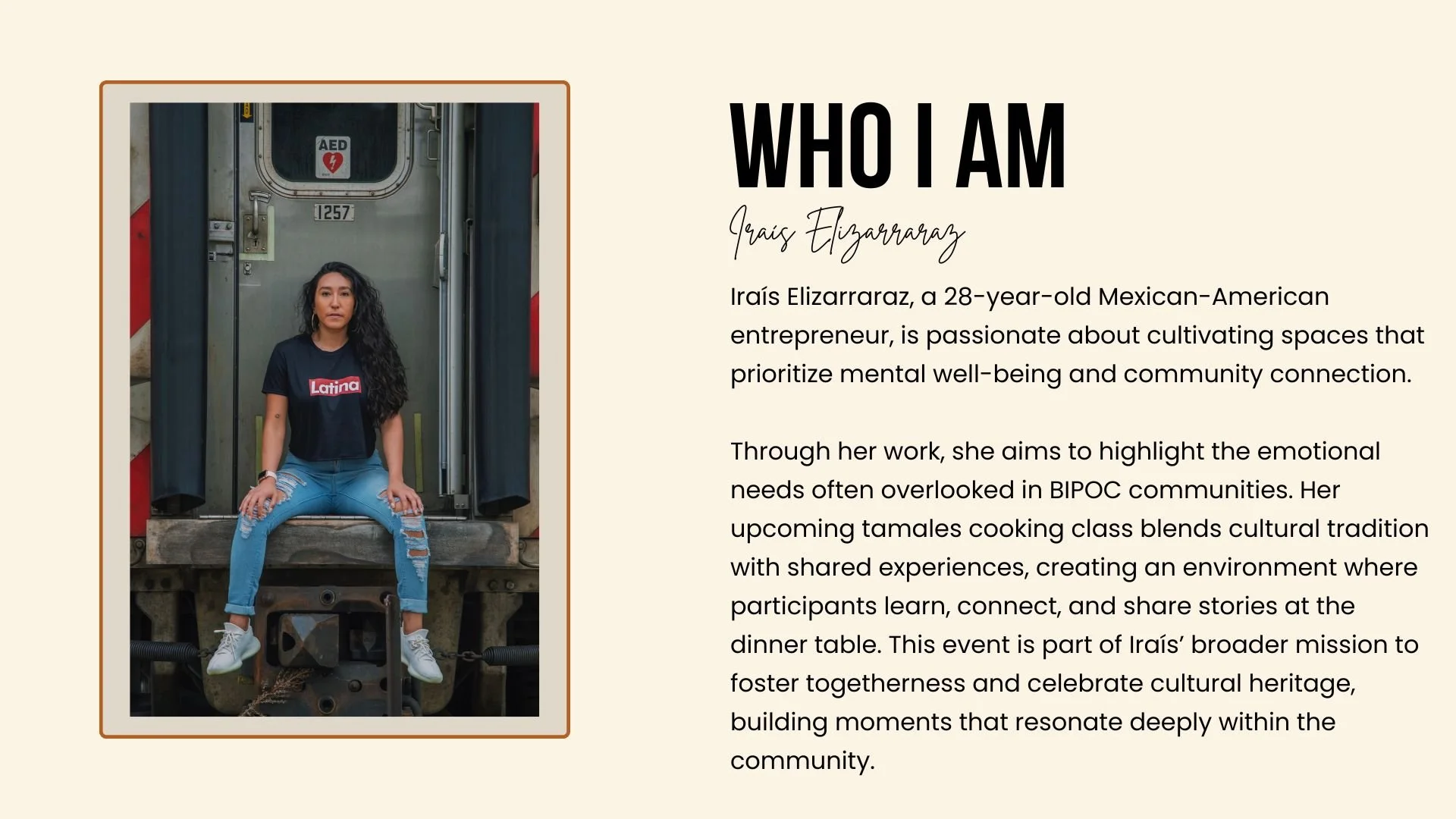 Text slide for Tamale Cooking Class, Holiday Traditions, Sin Titulo, with a beige background and stylized fonts.